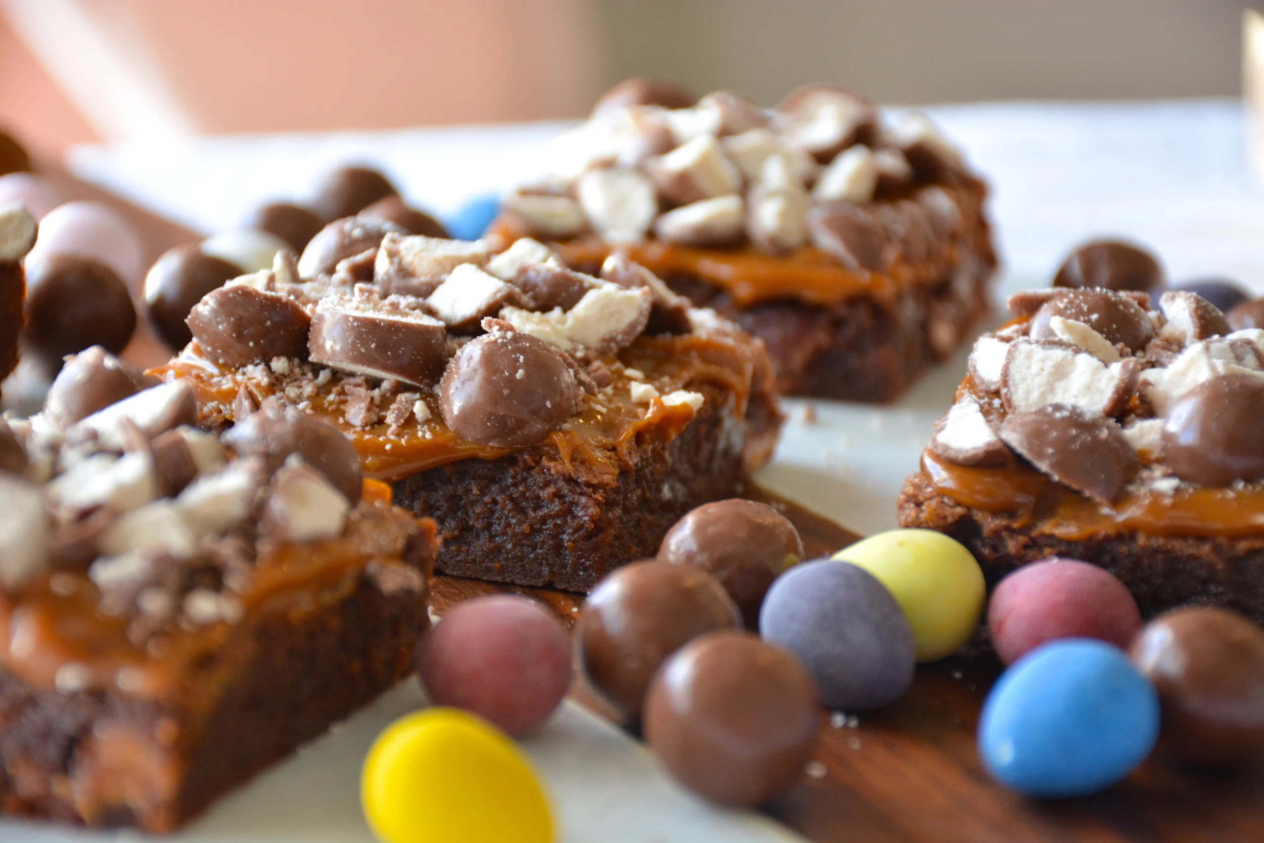 Malted Milk Chocolate Brownies with Salted Dulce de Leche Topping and Crushed Whoppers