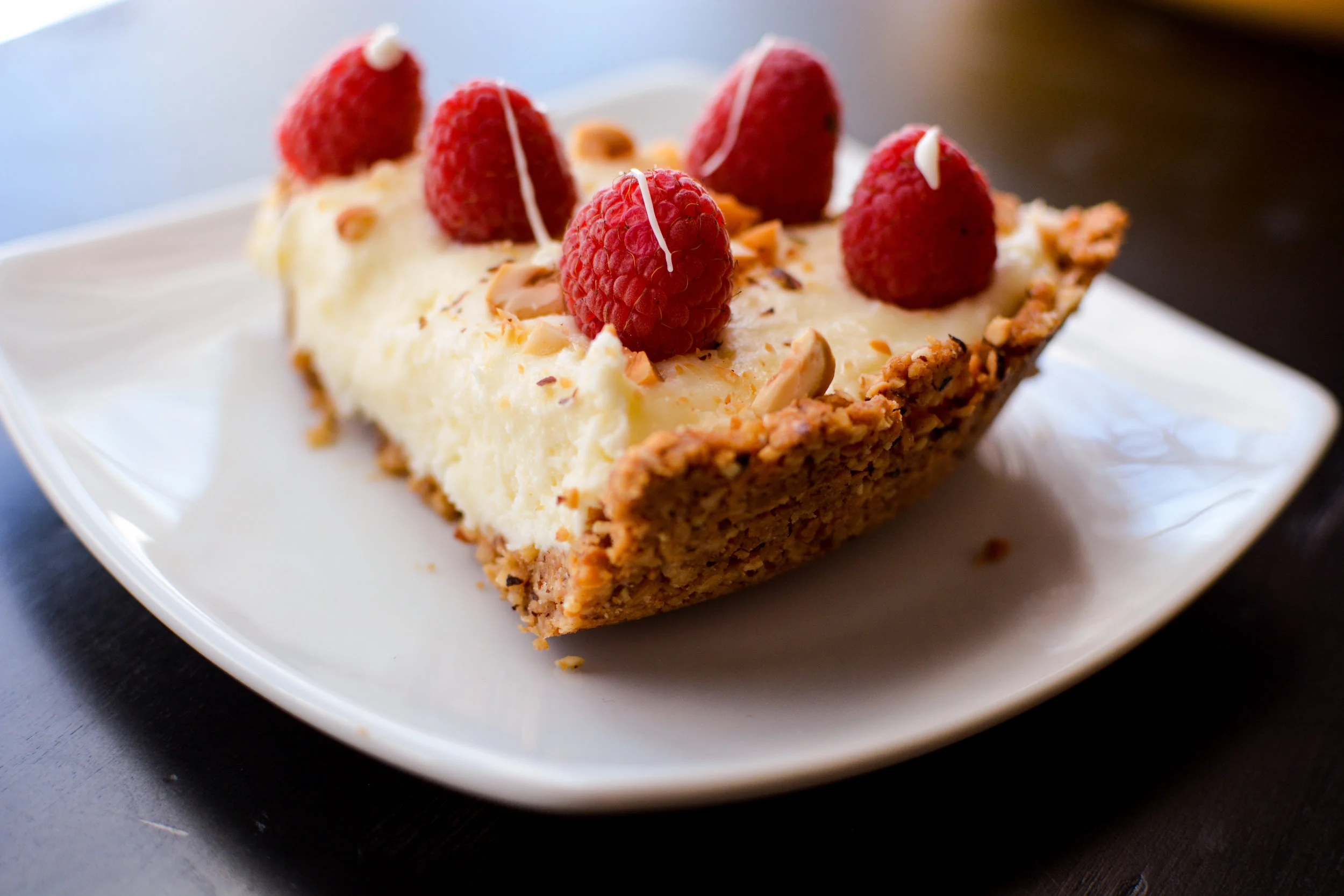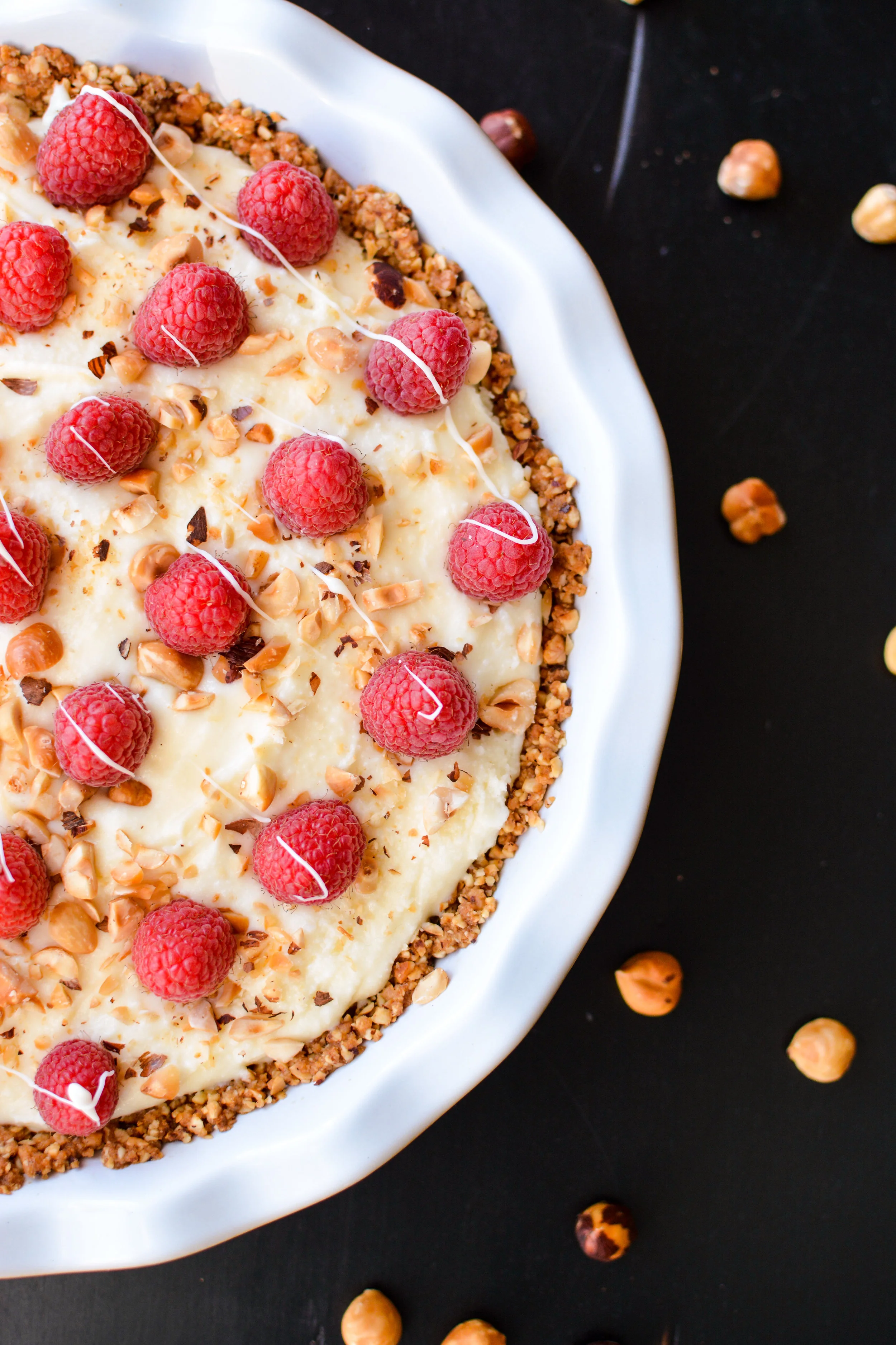 A creamy, white chocolate pie with a homemade hazelnut crust and topped with fresh raspberries